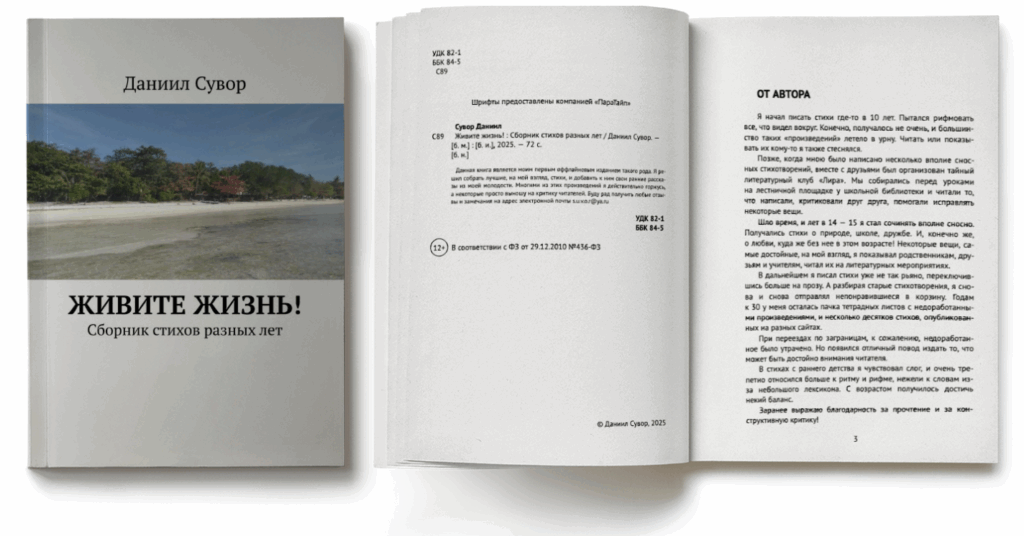 В 2022 году я начал работу над компоновкой первой своей книги, куда планировал включить стихи, рассказы и миниатюры. Но из-за нехватки времени и большой загруженности по работе, почти 3 года я не находил времени на то, чтобы закончить эту книгу.
