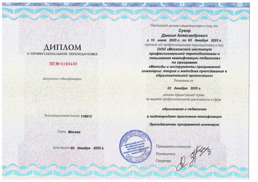 Сегодня я получил диплом преподавателя по программированию, наконец-то подтвердив свою квалификацию в этой сфере: