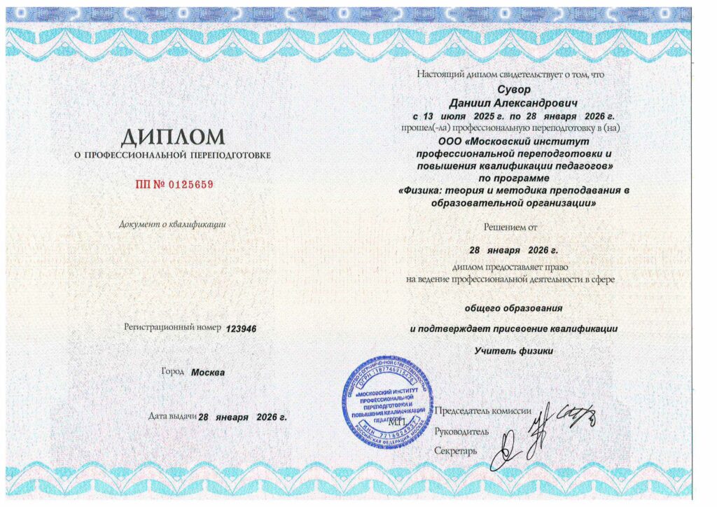 Сегодня я получил диплом за курс профессиональной переподготовки «Физика: теория и методика преподавания в образовательной организации»: