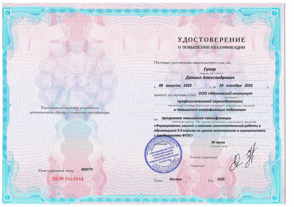 На прошлой неделе я повышал свою квалификацию по математике и истории, и сегодня получил удостоверения. Первое — за курс «Формирование умений и навыков самостоятельной работы у обучающихся 5-9 классов на уроках математики в соответствии с требованиями ФГОС»: