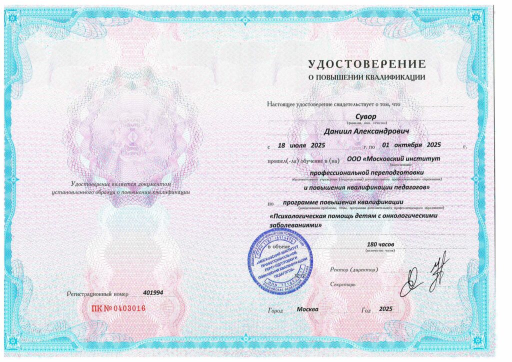 Следующий важный курс — это повышение квалификации по онкопсихологии. Данный курс меня заинтересовал не только для взрослых, но и для детей. К тому же, я прохожу сейчас курс переподготовки по детской психологии, так что дополнительные знания мне пригодятся. Консультирование детей с антивитальными настроениями и с тяжелыми заболеваниями имеют некоторые особенности, в изучение которых я хотел бы углубиться. Вот удостоверение по данному курсу: