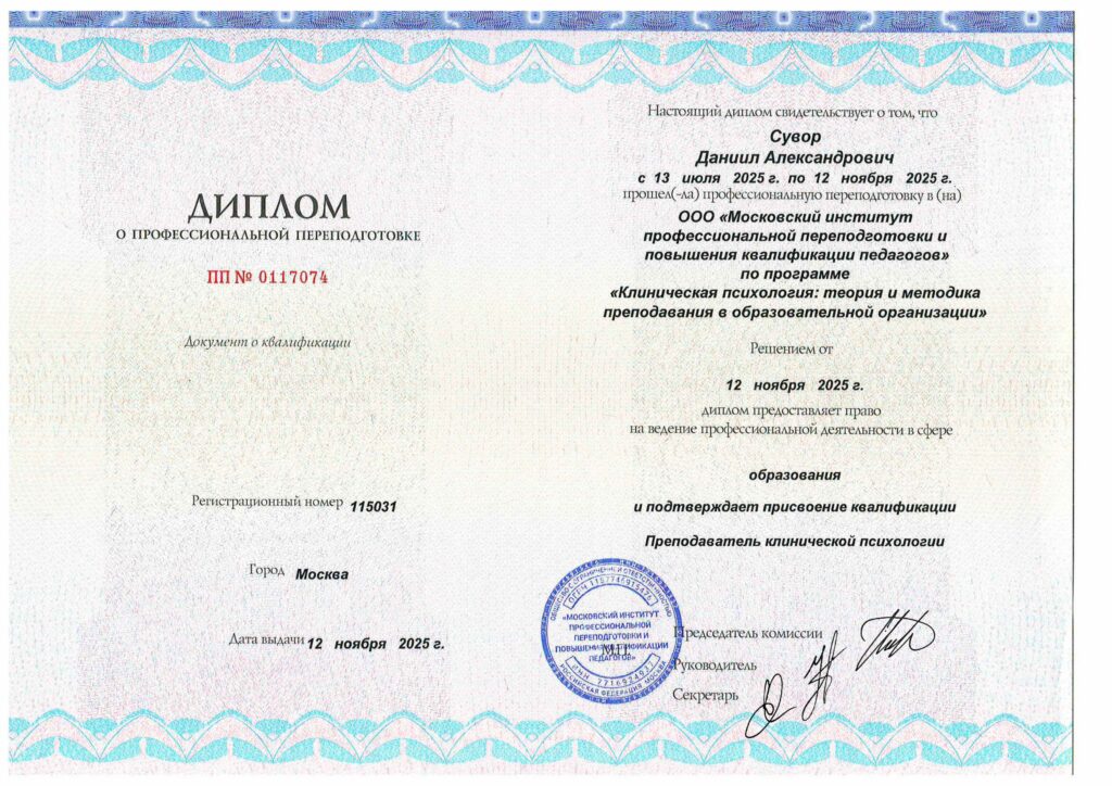 Сегодня я получил еще один диплом, дающий мне право преподавать клиническую психологию. Вот он: